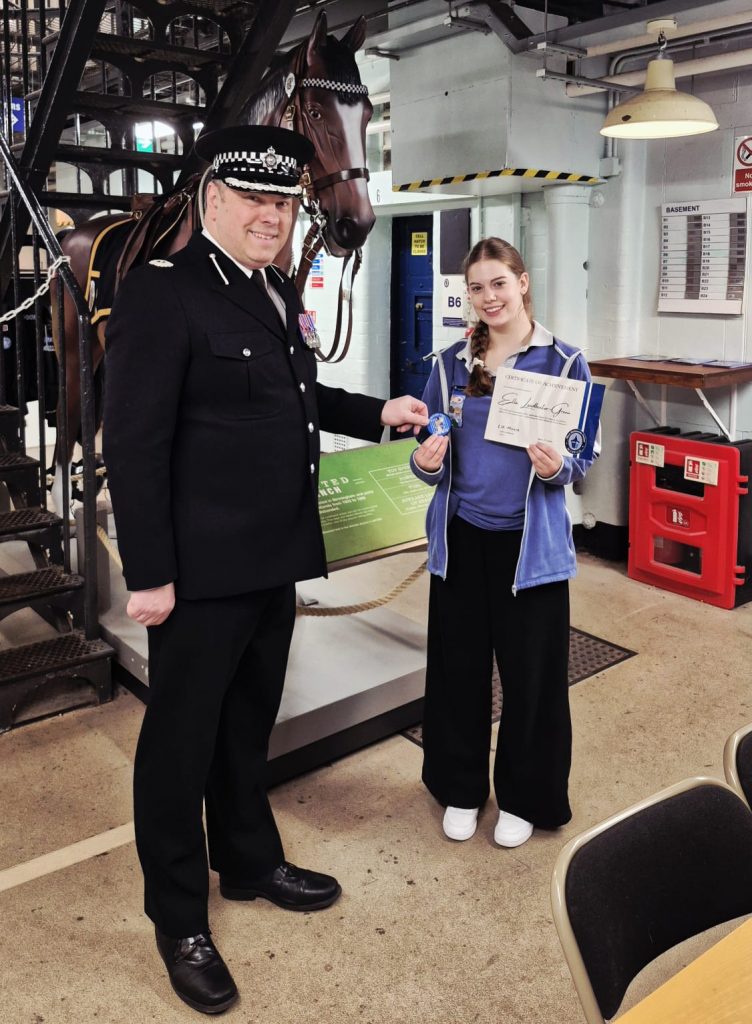 To celebrate Ella’s achievement we invited Assistant Chief Constable Parnell to join us here at the museum and present Ella with a certificate and her very own Lock-up patch with her design! ACC Parnell congratulated Ella and shared tales from his impressive career in the force, spanning over 25 years. The guides had interesting questions for ACC Parnell, from unsolved cases to how they could join the force and the different roles available to officers and police staff alike.
